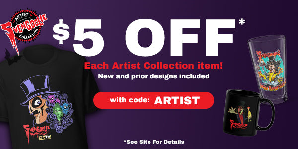 Original price $12.95 - Original price $21.95Original price$12.95 - $21.95$12.95 - $21.95Current price $12.95We're celebrating Svengoolie's single, The Svengoolie Stomp, with this new Svengoolie® 45th Anniversary design by artist Jeff Carlson. The music vi...